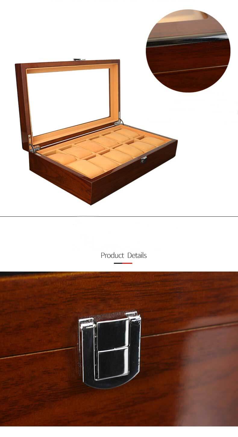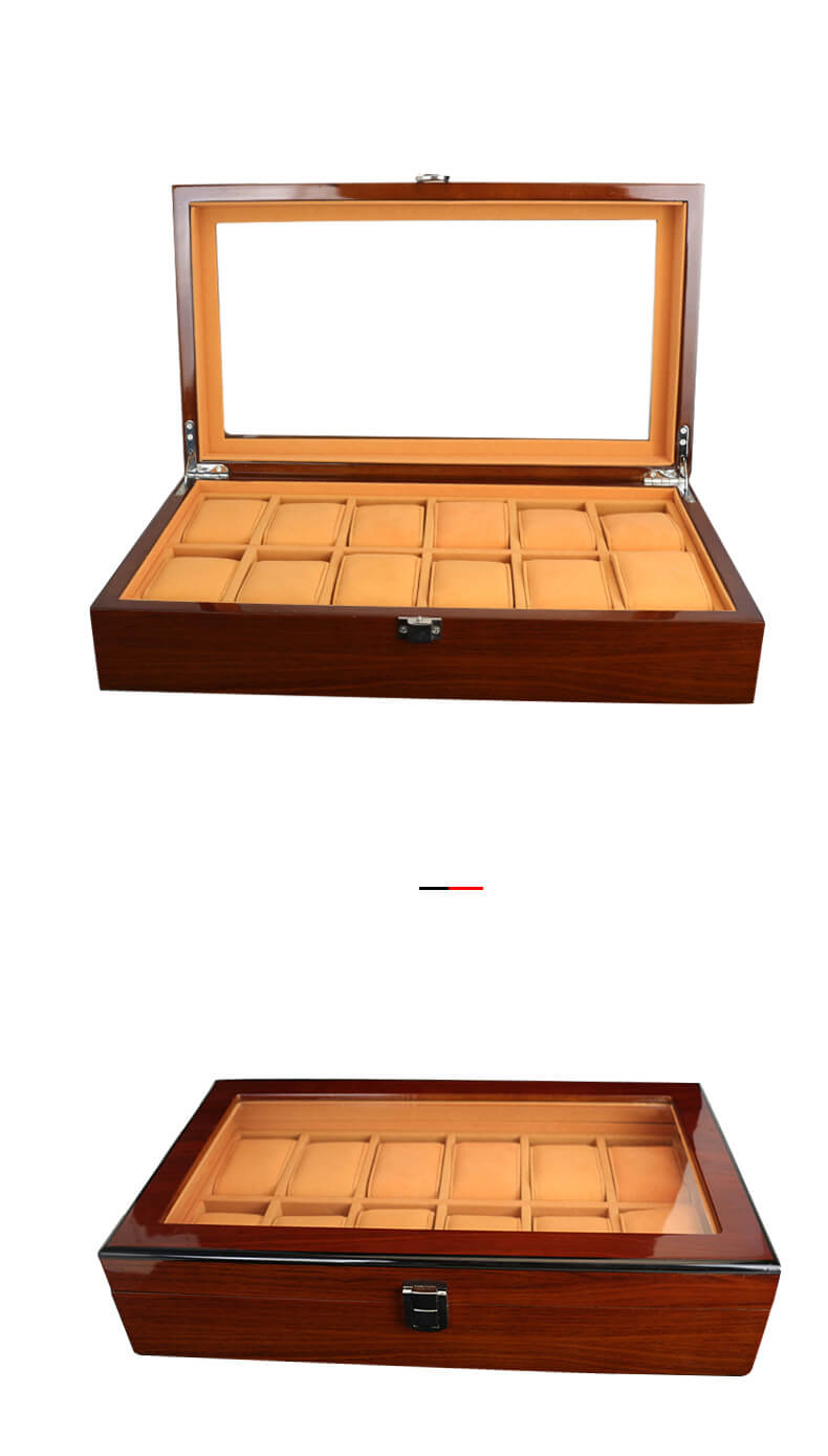 Custom Lacquered Wooden Watch Boxes Cases Watch Organizer Box with 12 slots. Designed with a clear transparent qualify glass top lid to enable easy viewing of the watches inside and keep the watches dust free