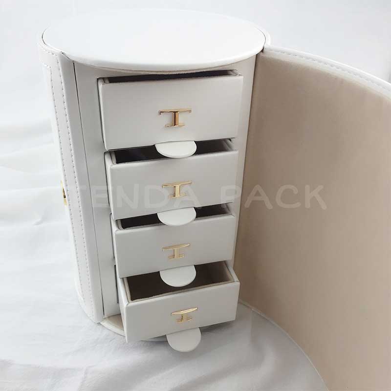 Cylindrical Shape Portable Leather Storage Box with four drawers, simple structure with plastic frame, white PU leather exterior, shiny gold metal logo.